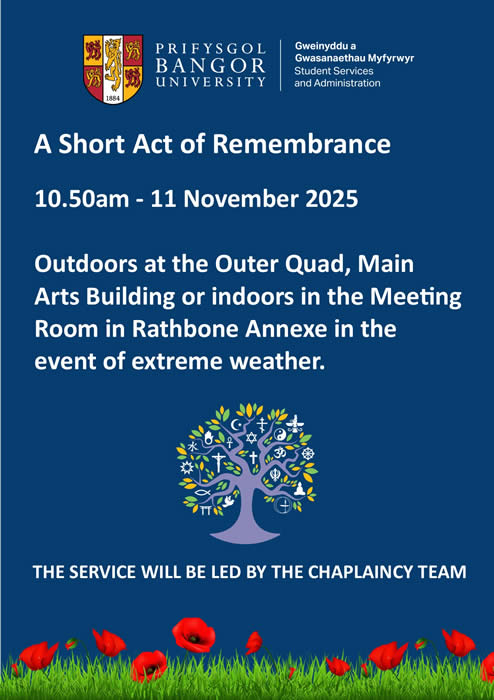 The service will be led by Rev John Thompson, Minister at Penrallt Baptist Church. John is one of the volunteering Chaplains on the University Chaplaincy Team.