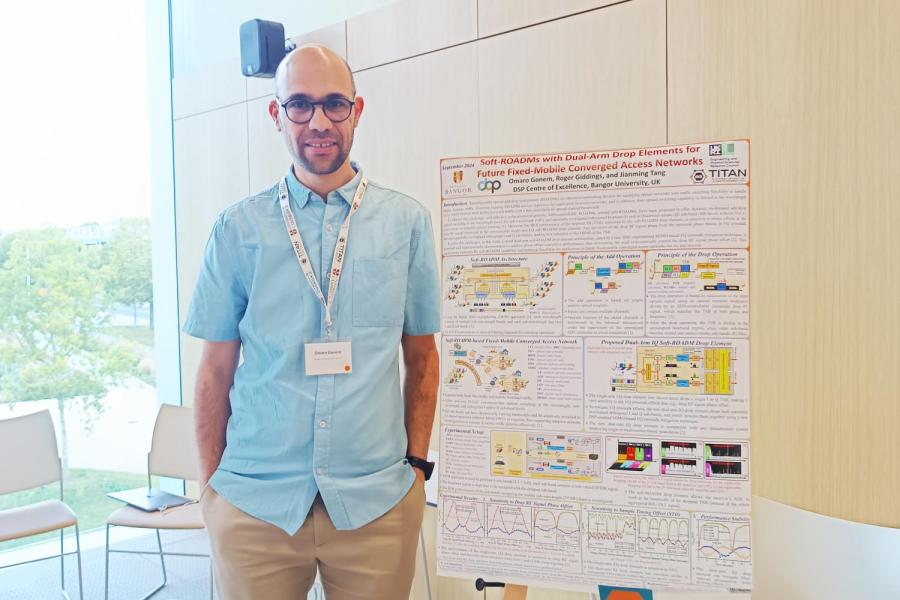Omaro Gonem research poster titled ‘Soft-ROADMs with Dual-Arm Drop Elements for Future Fixed-Mobile Converged Access Networks’, this research work proposes and experimentally verifies a novel cost-effective optical switching device with phase-offset-insensitive performance for future fixed and mobile access network convergence in 6G and beyond.