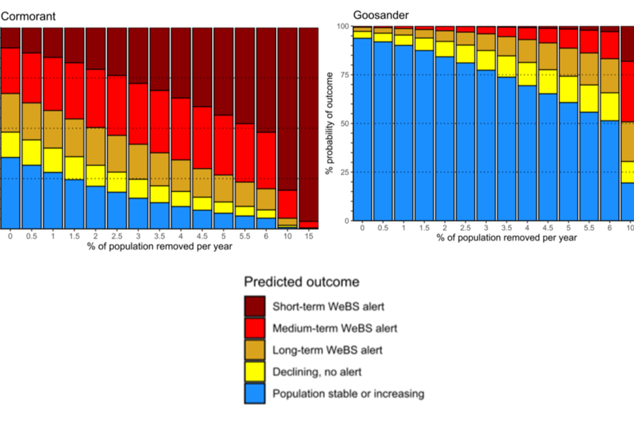 Lastly, the researchers attempted to assess the Cormorant and Goosander's resilience should licensed lethal control measures were to be implemented by conducting a population viability analysis. They discovered that based on population modelling using BTO's WeBS Alerts system (3), the Cormorant's population is already at risk of declining, leading to a chance in conservation status without any culling scenarios implemented. Meanwhile Goosander's population is highly likely to keep increasing even with a 5% culling scenario.