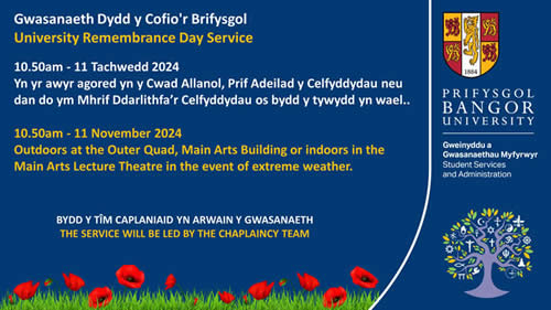 Cynhelir Gwasanaeth Dydd y Cofio byr ddydd Llun, 11 Tachwedd, yn yr awyr agored yn y Cwad Mewnol, Prif Adeilad y Celfyddydau neu dan do ym Mhrif Ddarlithfa’r Celfyddydau os bydd y tywydd yn wael.